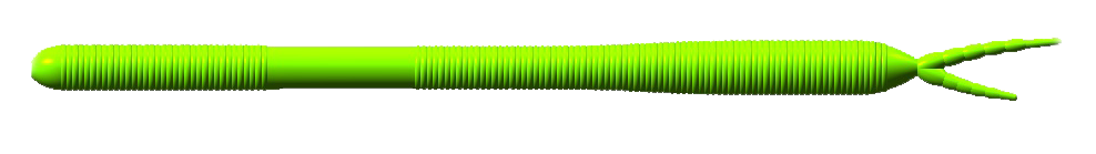 中心部より、1.5mm の太さを持たせて設計。細身のストレートタイプのワームでありながら、トルクフルな水流を撹拌・発生させます。より大型のベイトを思わせ、よりビッグな個体のバスを引き寄せます。