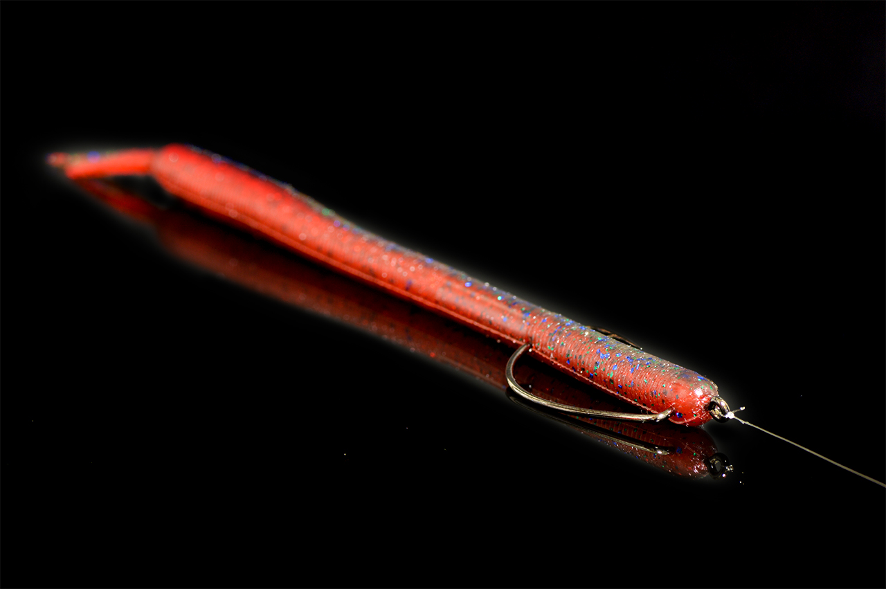 ビッグバスを手にしたい時、考えられる方法はいくつかある。ビッグベイトのボディーサイズがもたらすインパクトで、食性・威嚇の本能を呼び覚まし、口を使わせる。ラバージグで怒りの本能に火を付ける。アラバマリグで食性を狂わせてバイトさせる…しかしそれも、すぐに答えが出るような容易なものではない。閑暇ないその猛攻に、学習能力の高いビッグバスであればあるほど警戒心をMAX に、本能そのものを閉ざしてしまうだ。狡猾極まりない強者を目の前に手をあぐね、アングラー自身の精も魂も尽き果てる。何ら手出しすることが出来ない、そのような時が少なからずある。わずかに残る執念だけが、ロッドを振らせている。エリアは静まりかえり緊張感もMAX に。いよいよクライマックスを迎えたとき、喰いやすい細身のストレート系ワームが、再び彼らの本能に火を付けることができる。先述のビッグバス攻略法とは、対極に位置する。食べやすい細身であり、その柔らかさから生命感がみなぎり、百戦錬磨の強者ビッグバスをも虜にしてしまう。最終にして、究極の“喰わせ”の最終兵器。