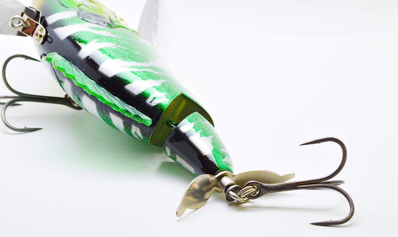 しなやかに曲がるエラストマー製の背ビレ・尻ヒレパーツを装着。金属パーツが多く、機械的な泳ぎの印象が強いクローラー・ベイトですが、フィン・パーツによって、水を受けては柔らかく曲がり押し返す連続運動によって、泳ぎの角ばりを抑え、ナチュラルな泳ぎをパフォーマンスします。