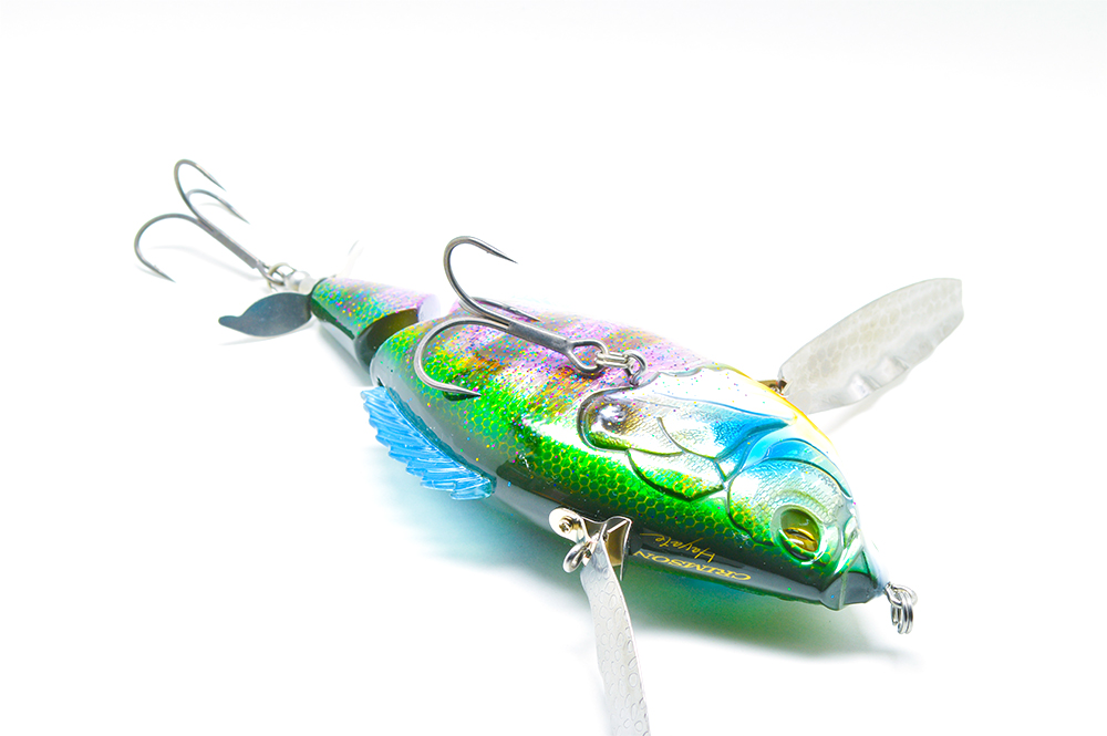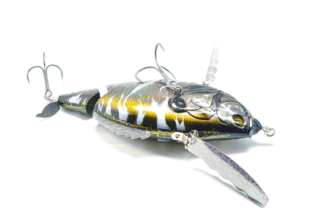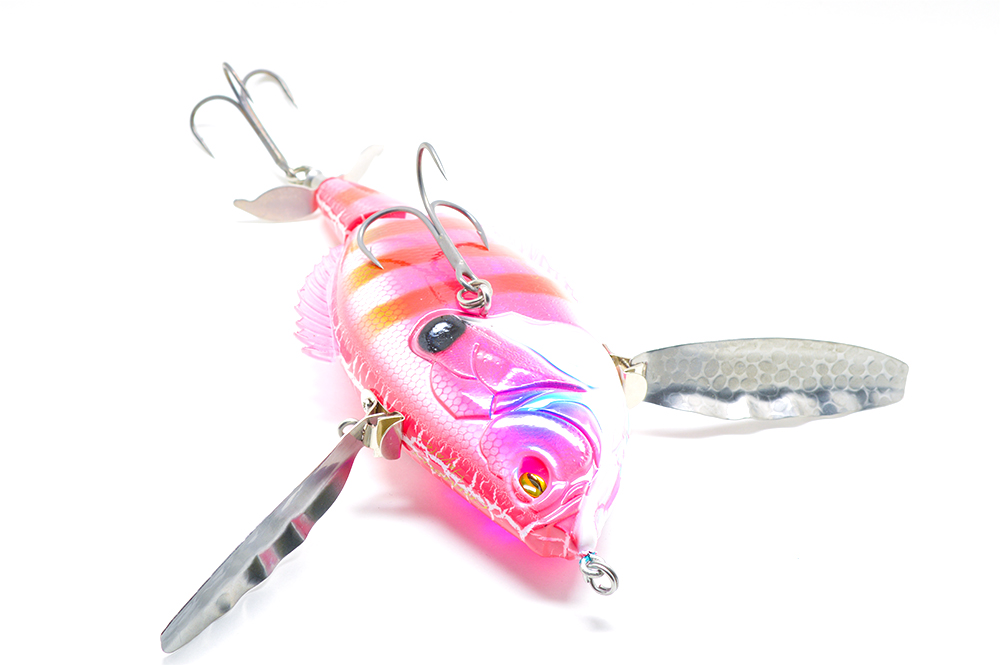 ワイドな扁平ボディーによる“もがき”=絶妙に身を“ねじる”ようなボディー・ロールは、実に“生々しい”泳ぎを披露するとともに、水を大きくすくい上げることによって膨大なまでの撹拌水流を発生させ、そのアピール度は強烈。